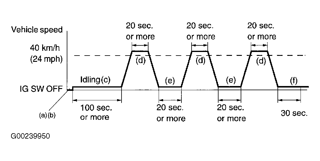 Connect scan tool to Data Link Connector (DLC) No. 3. See Figure. If using Lexus scan tool, switch to CHECK mode. On both scan tools, start and warm engine to normal operating temperature. Allow engine to idle for 100 seconds or more. Drive vehicle at 24 MPH or more for 20 seconds. Stop vehicle and allow to idle for 20 seconds. Repeat driving and idle part of test 2 more times. At last idle test, allow to idle for 30 seconds. See Figure. If using OBD-II scan tool, turn engine off. Repeat this procedure. If using either scan tool, if malfunction exists, MIL will illuminate.