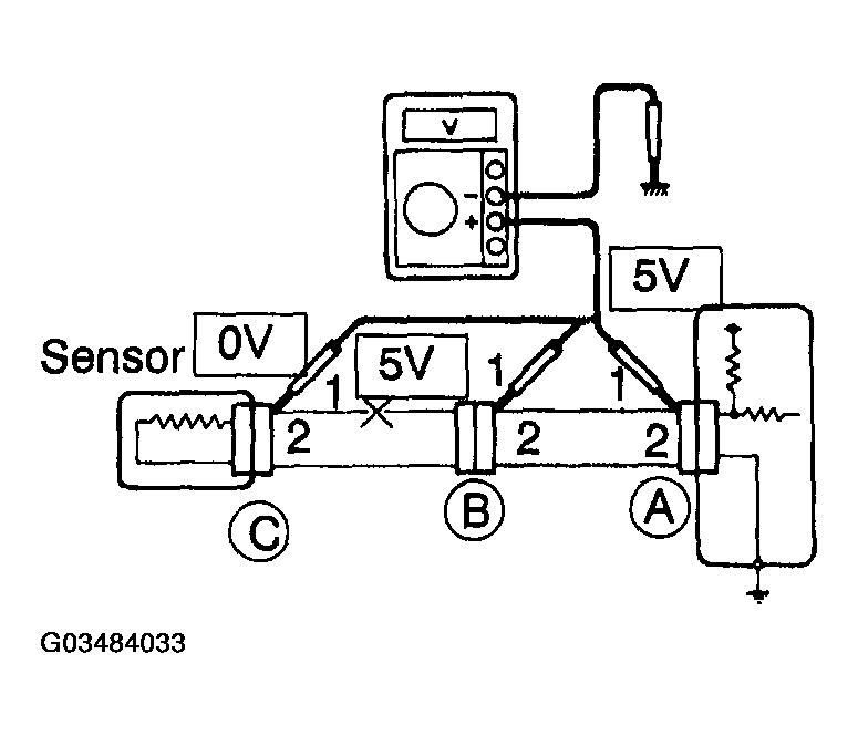 As shown in Fig 9, with each connector still connected, measure the voltage between the body ground and terminal 1 of connector A at the ECU 5 V output terminal, terminal 1 of connector B, and terminal 1 of connector C, in that order.