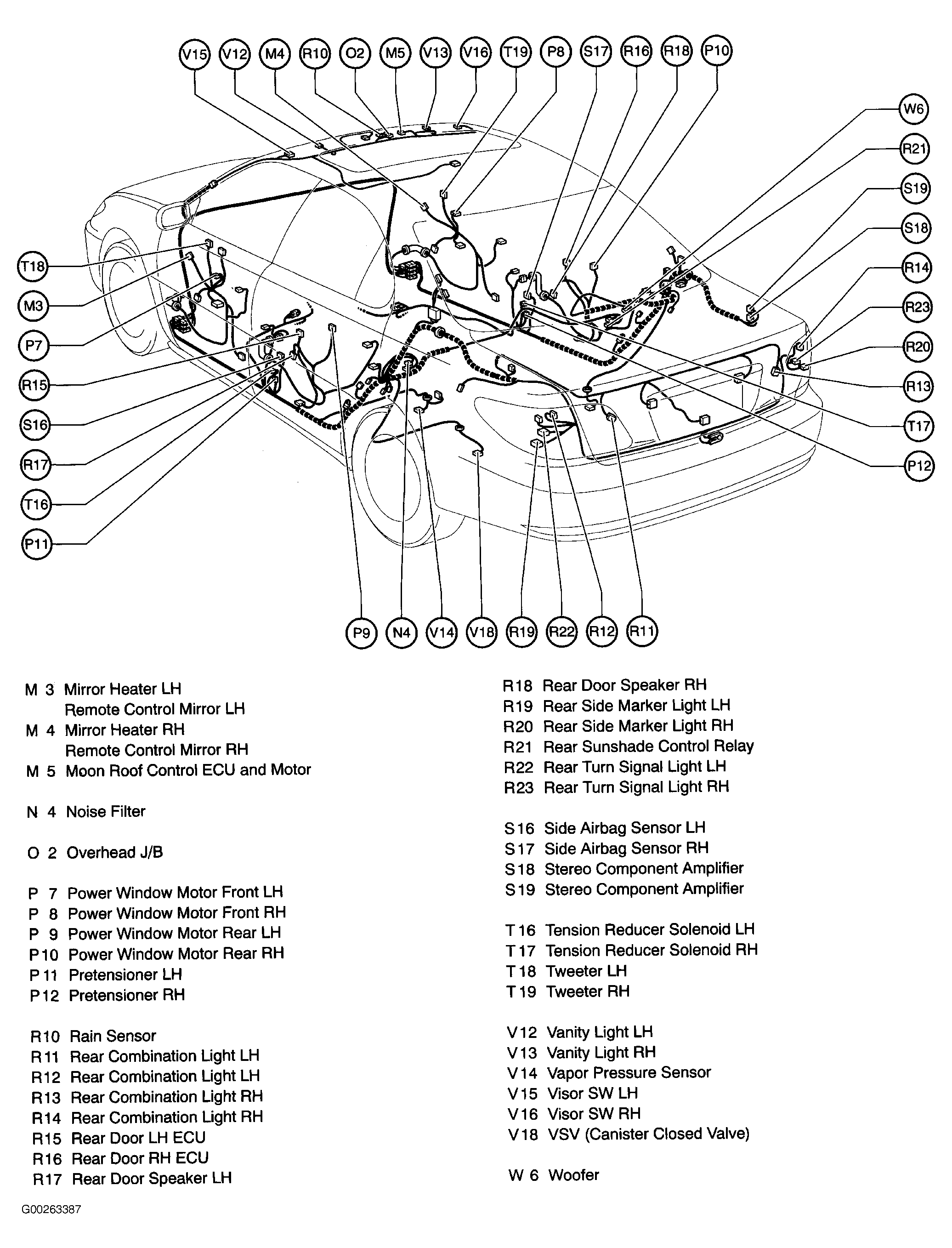 | Stereo Component Amplifier (Mark Levinson) | On right side of luggage compartment. See Figure. |