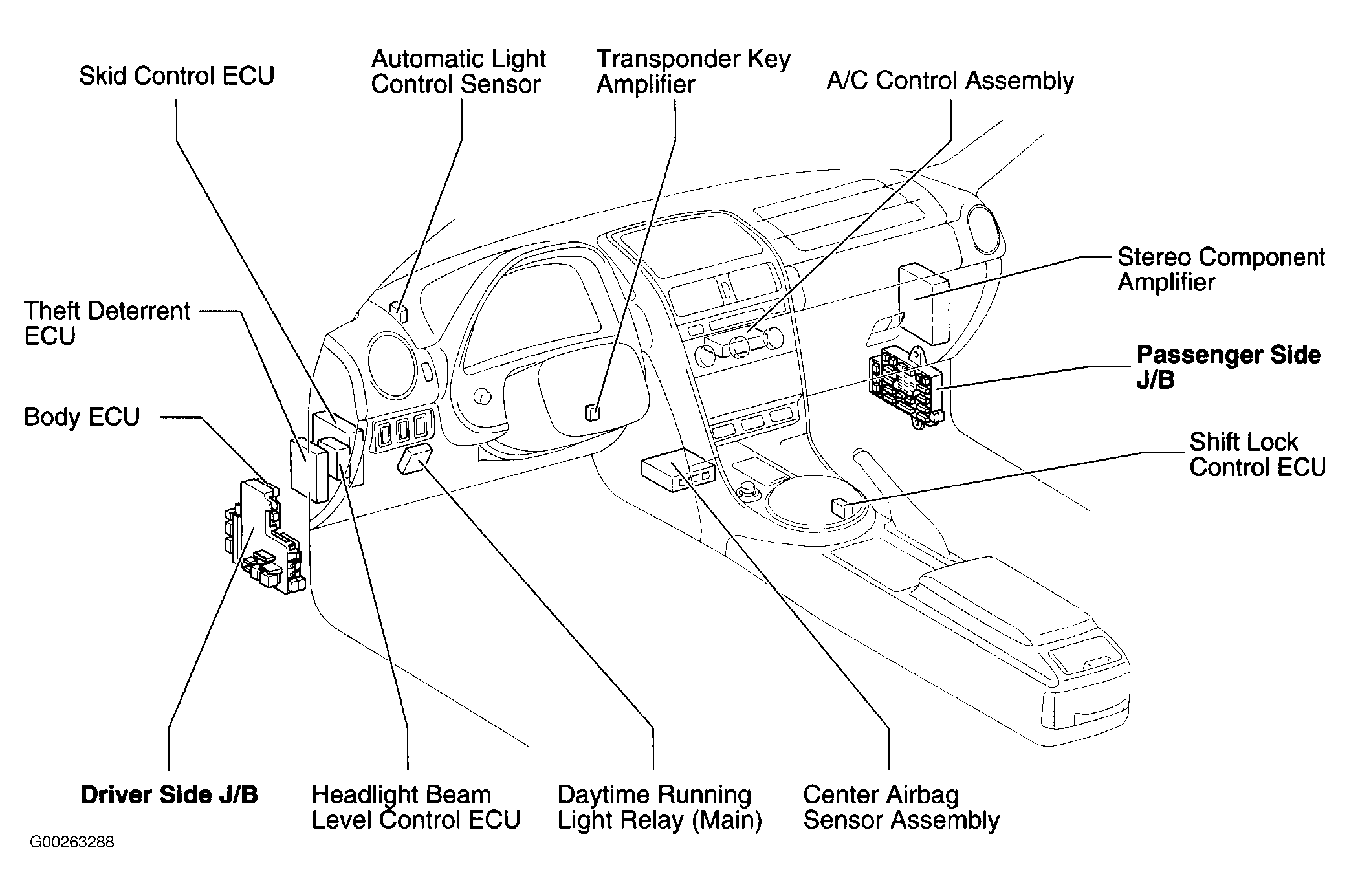 Shift Lock Control ECU Below right side of transmission shift lever. See Figure.