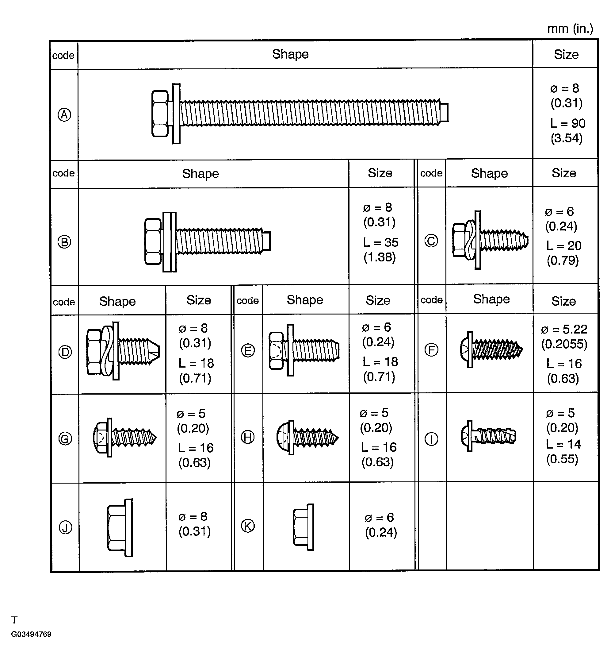 Screw shapes and sizes are indicated in Fig 4 . The codes ("A" - "K") correspond to those in Fig 1, Fig 2 and Fig 3 .