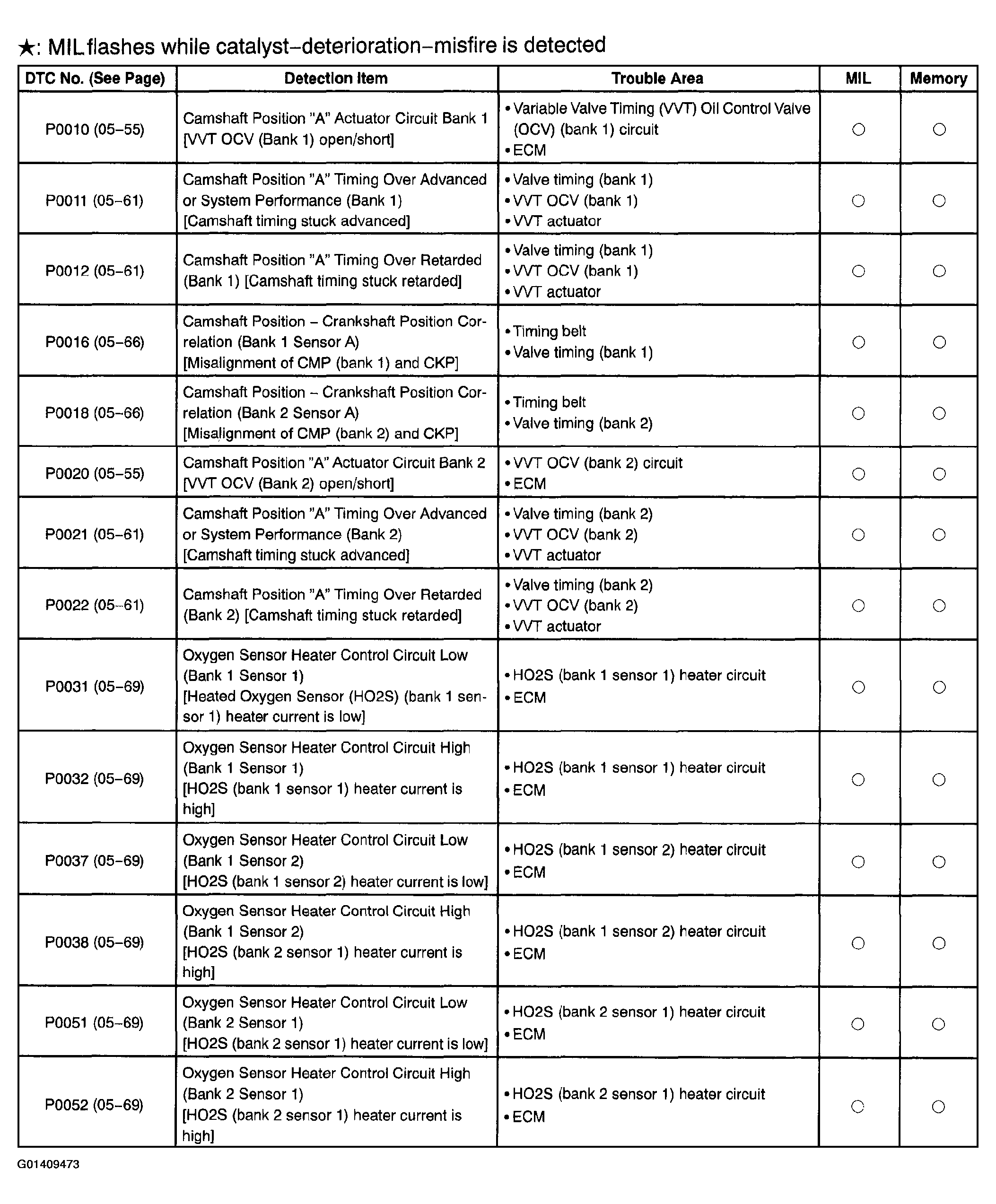 | DTC P0011, P0012, P0021, P0022 | CAMSHAFT POSITION "A" - TIMING OVER-ADVANCED OR SYSTEM PERFORMANCE (BANK 1) |