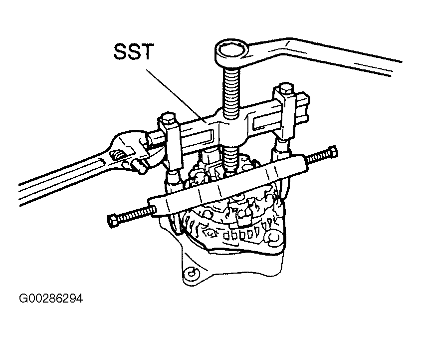 1. Remove rear end cover. See Fig 1. Remove brush holder. Use generator Pulley Set Nut Wrench Set (SST 09820-63011) to remove generator pulley.