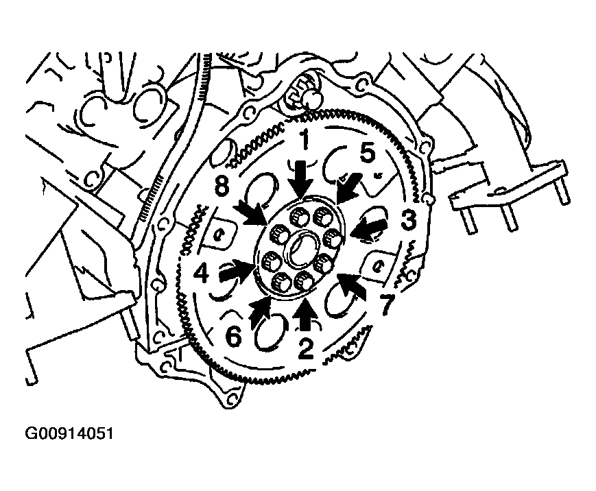 - Hold the crankshaft pulley bolt with a wrench, and install and evenly tighten the 8 mounting bolts, a little at a time for several times as in the sequence shown in Fig 2
