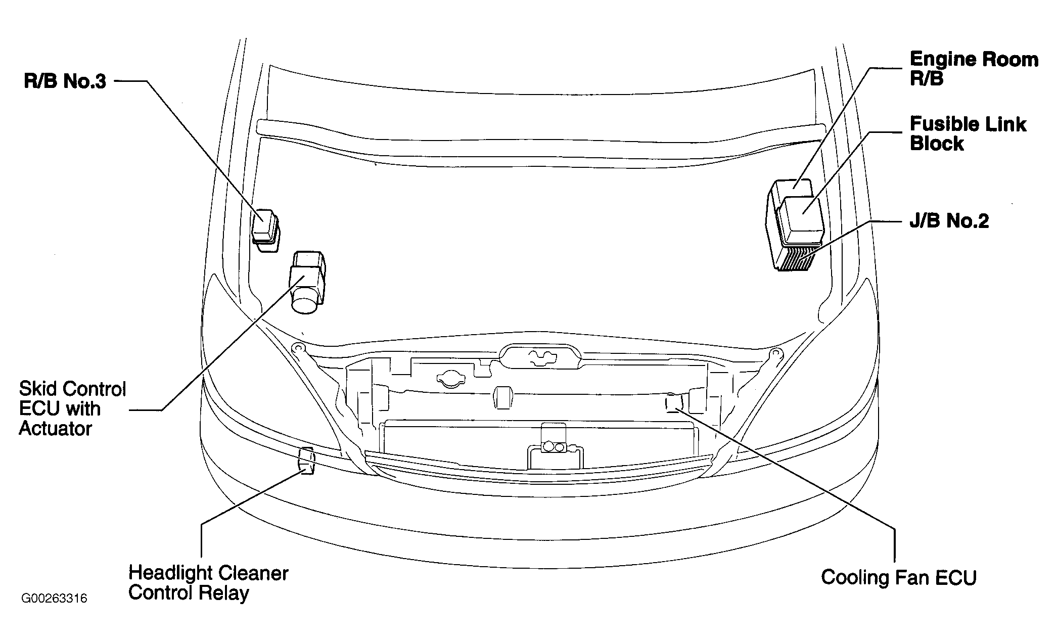 | Cooling Fan ECU | Left front of engine compartment. See Figure. |