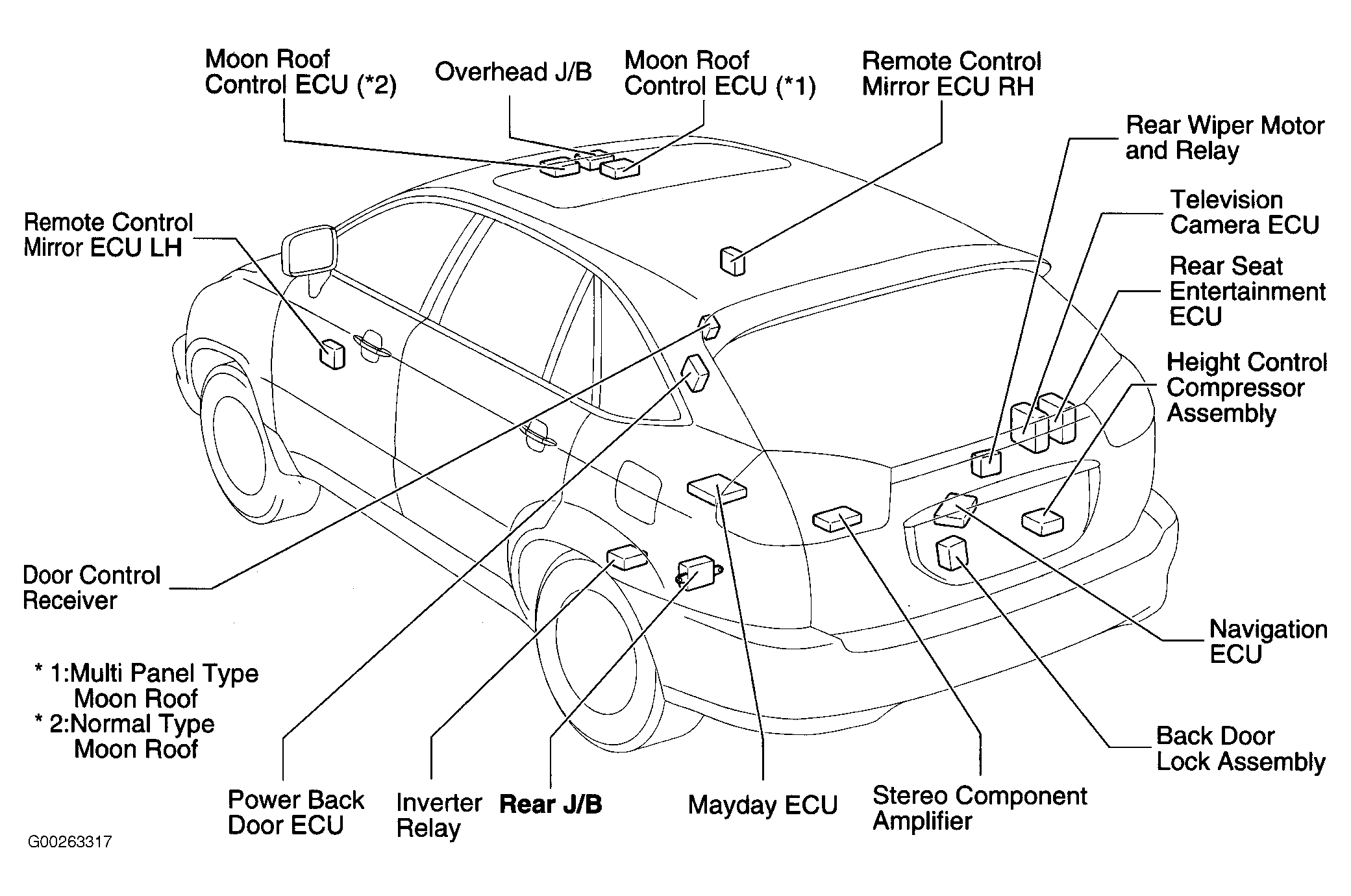 | Moon Roof Control ECU (Normal Type Moon Roof) | On front center of moon roof. See Figure. |