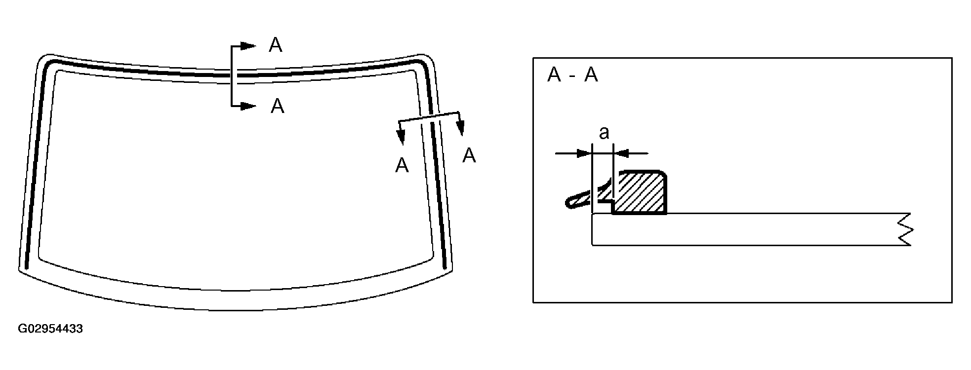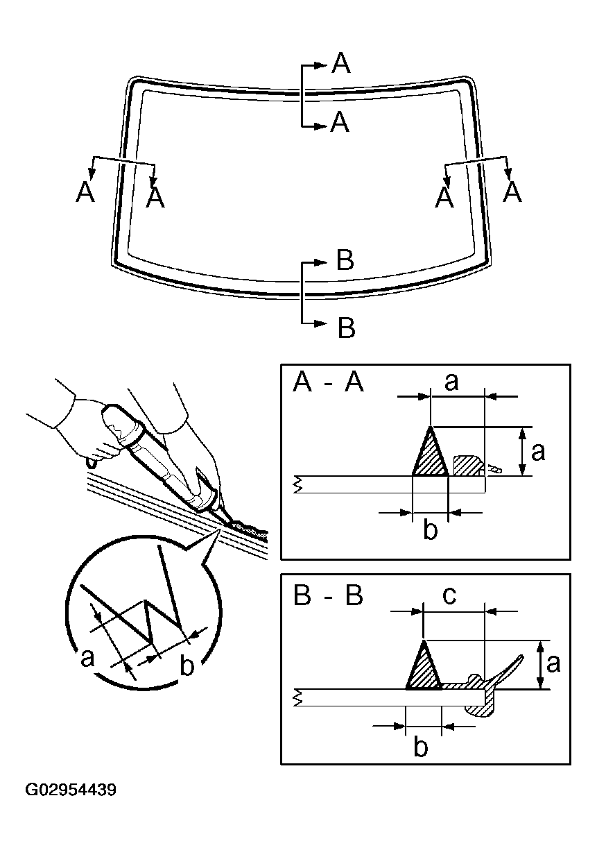 MEASUREMENT CHARTArea Measurement a 12.0 mm (0.472 in.) b 8.0 mm (0.315 in.) c 14.5 mm (0.571 in.) - Install the glass to the vehicle body.