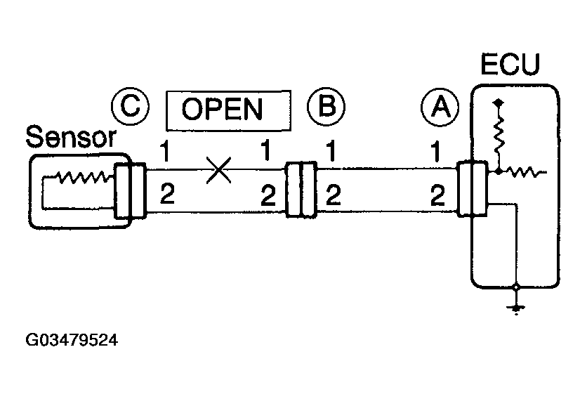 If your results match the examples above, an open circuit exists in the wire harness between terminal 1 of B and terminal 1 of C.