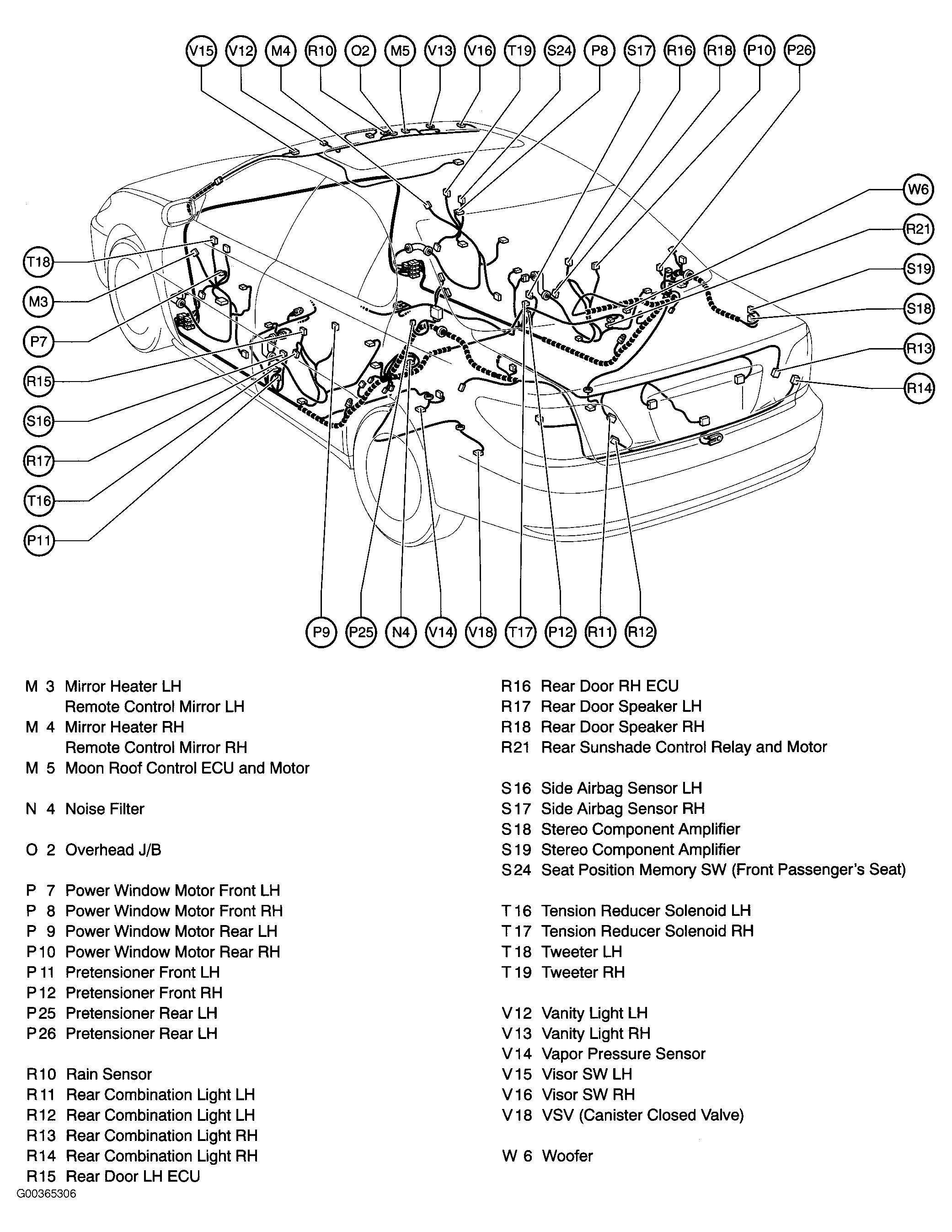 | Stereo Component Amplifier (Mark Levinson) | On right side of luggage compartment. See Figure. |