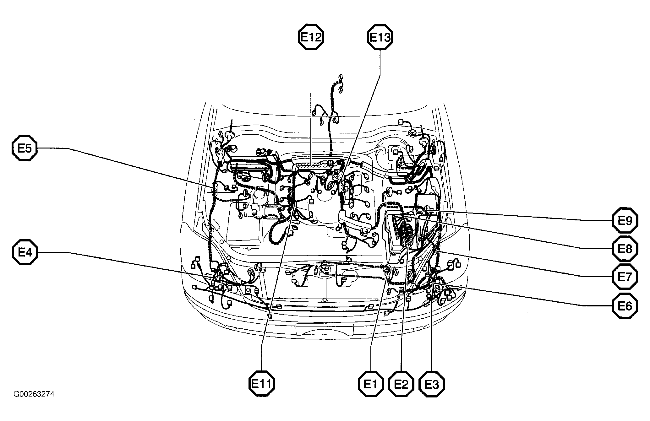 | E5 | In engine harness, at center of right inner fender panel. See Figure. |