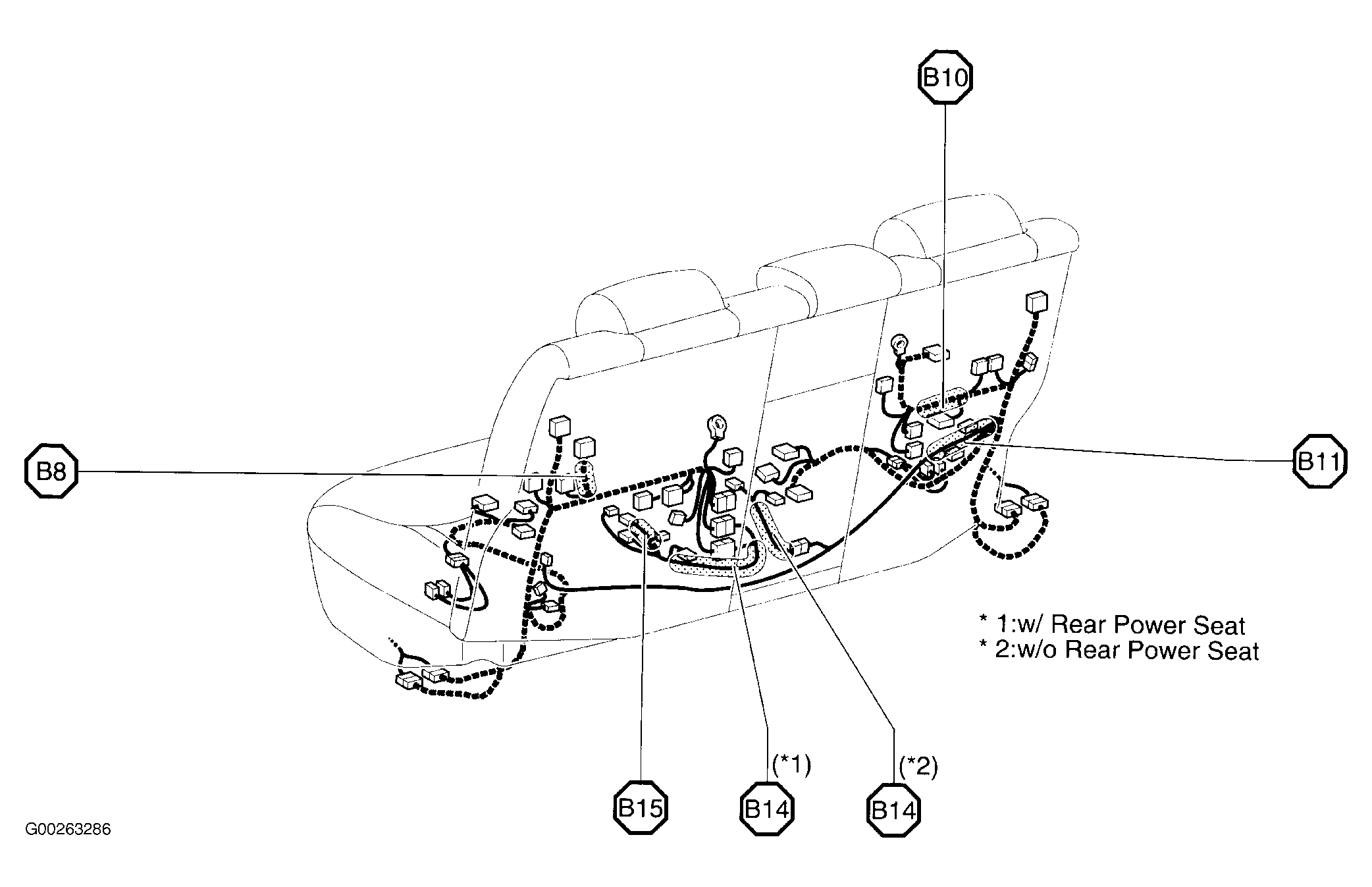 | B14 (W/Rear Power Seat) | Center of rear seat. See Figure. |
