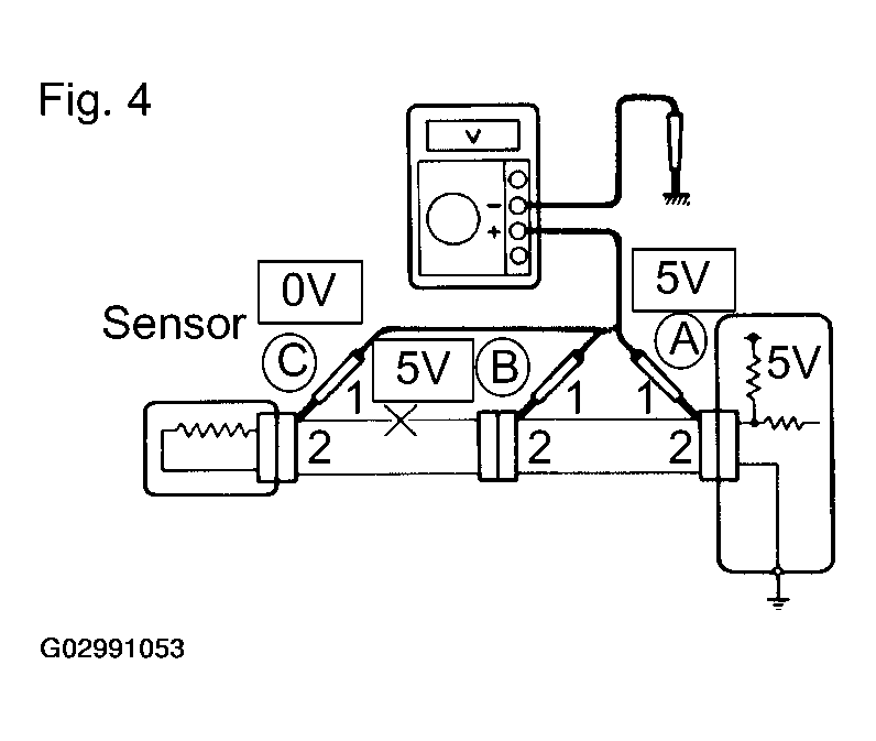 - As shown in Fig 12, with each connector still connected, measure the voltage between body ground and terminal 1 of connector "A" at the ECU 5V output terminal, terminal 1 of connector "B", and terminal 1 of connector "C", in that order.