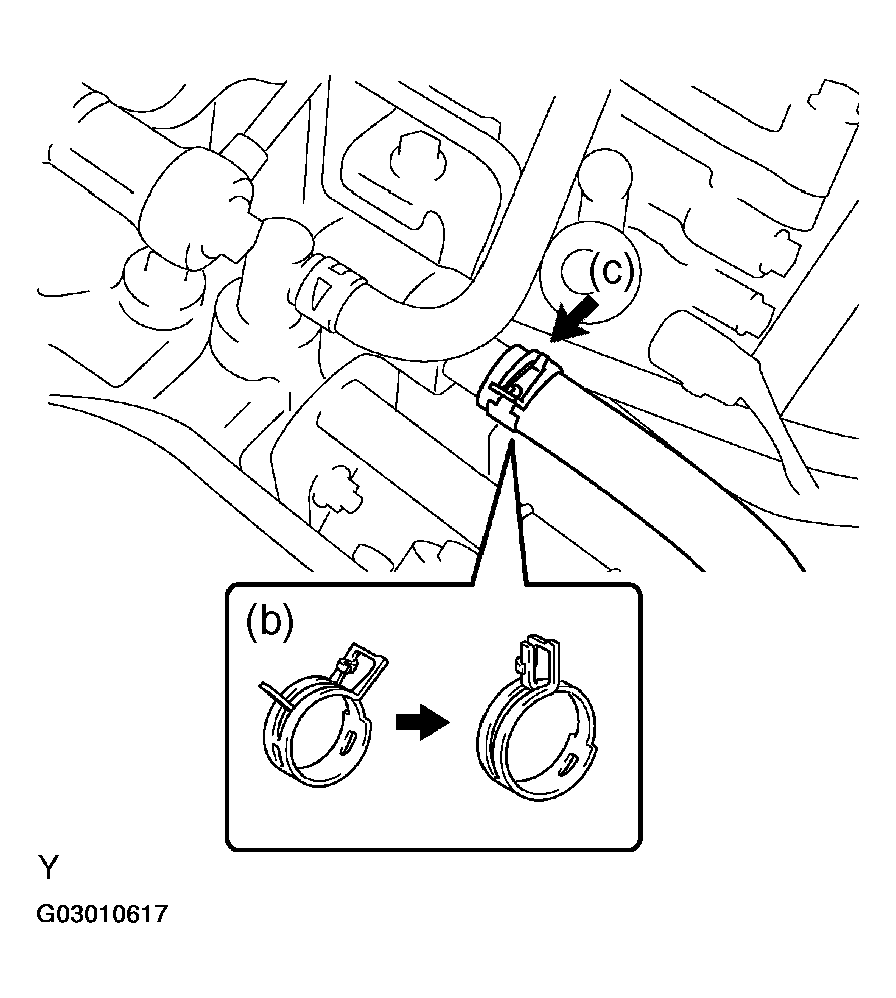 - Install the water outlet together with water by-pass hose No. 1 and unlock the hose clamp.