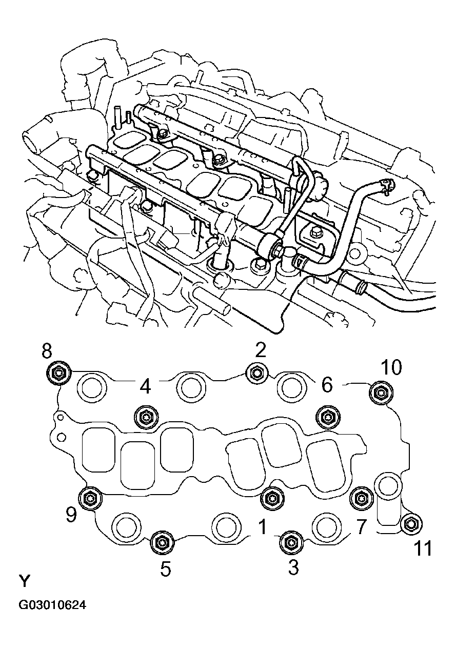 - In order to remove the intake manifold, using several steps, remove the 9 bolts and 2 nuts in the sequence shown in Fig 5 .