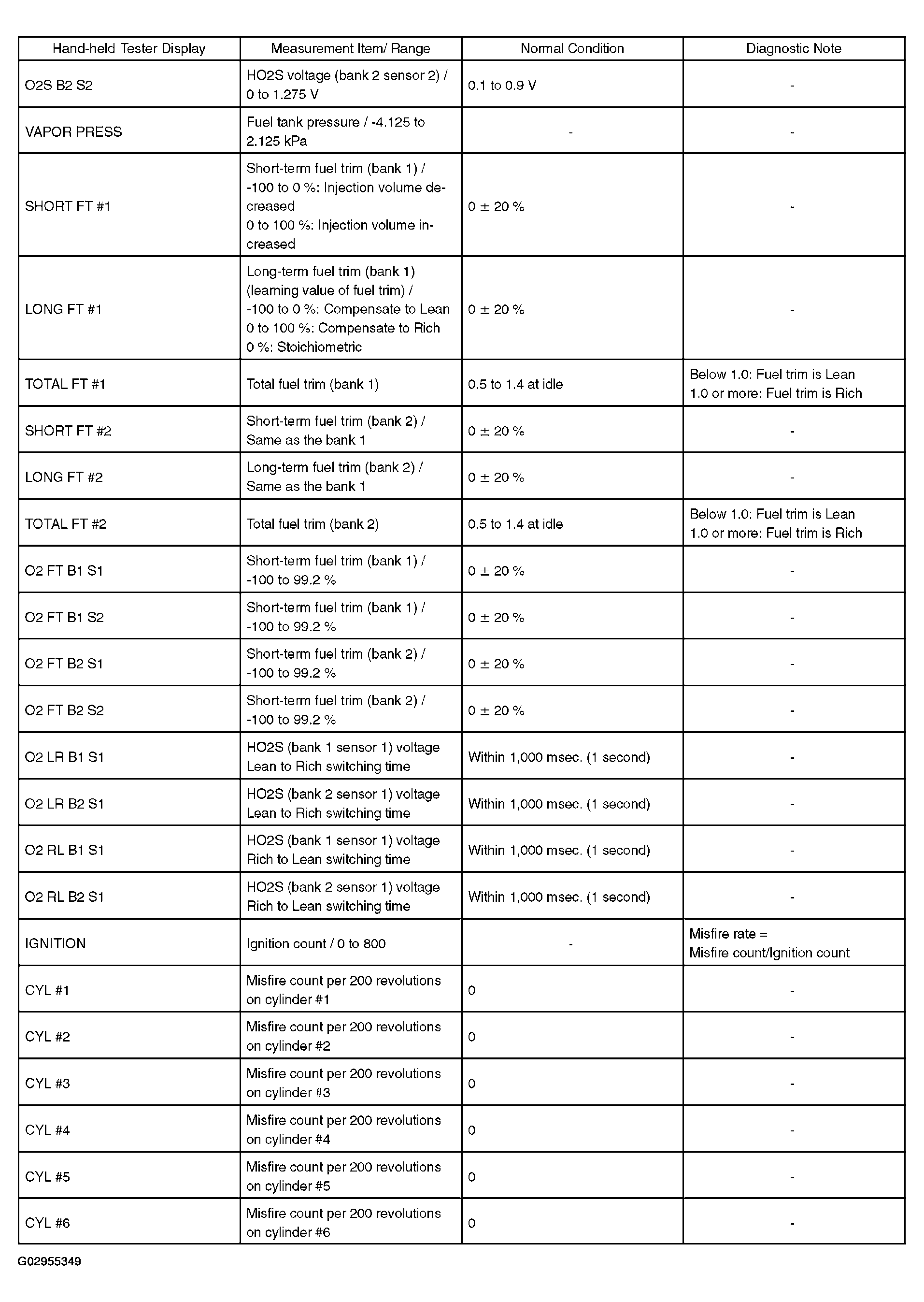 NOTE: In Fig 1, the values listed under "Normal Condition" are reference values. Do not depend solely on these reference values when deciding whether a part is faulty or not.- Warm up the engine.