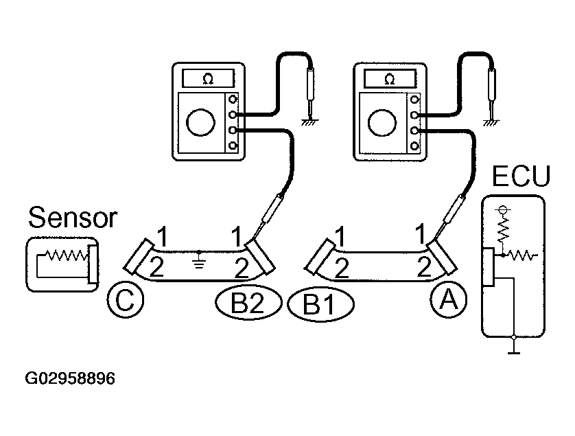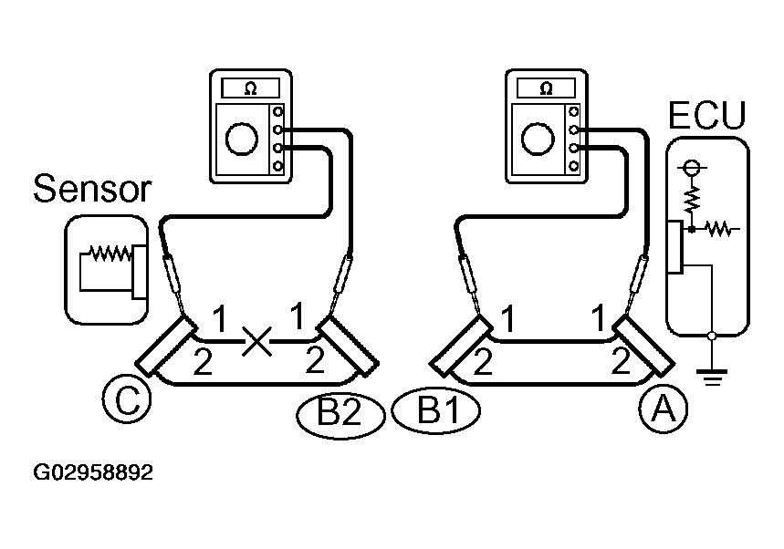 RESISTANCE SPECIFICATIONSTester Connection Specified Condition Connector A terminal 1 - Connector B1 terminal 1 Below 1 ohms Connector B2 terminal 1 - Connector C terminal 1 10 k ohms or higher If your results match the examples above, an open circuit exists between terminal 1 of connector B2 and terminal 1 of connector C.