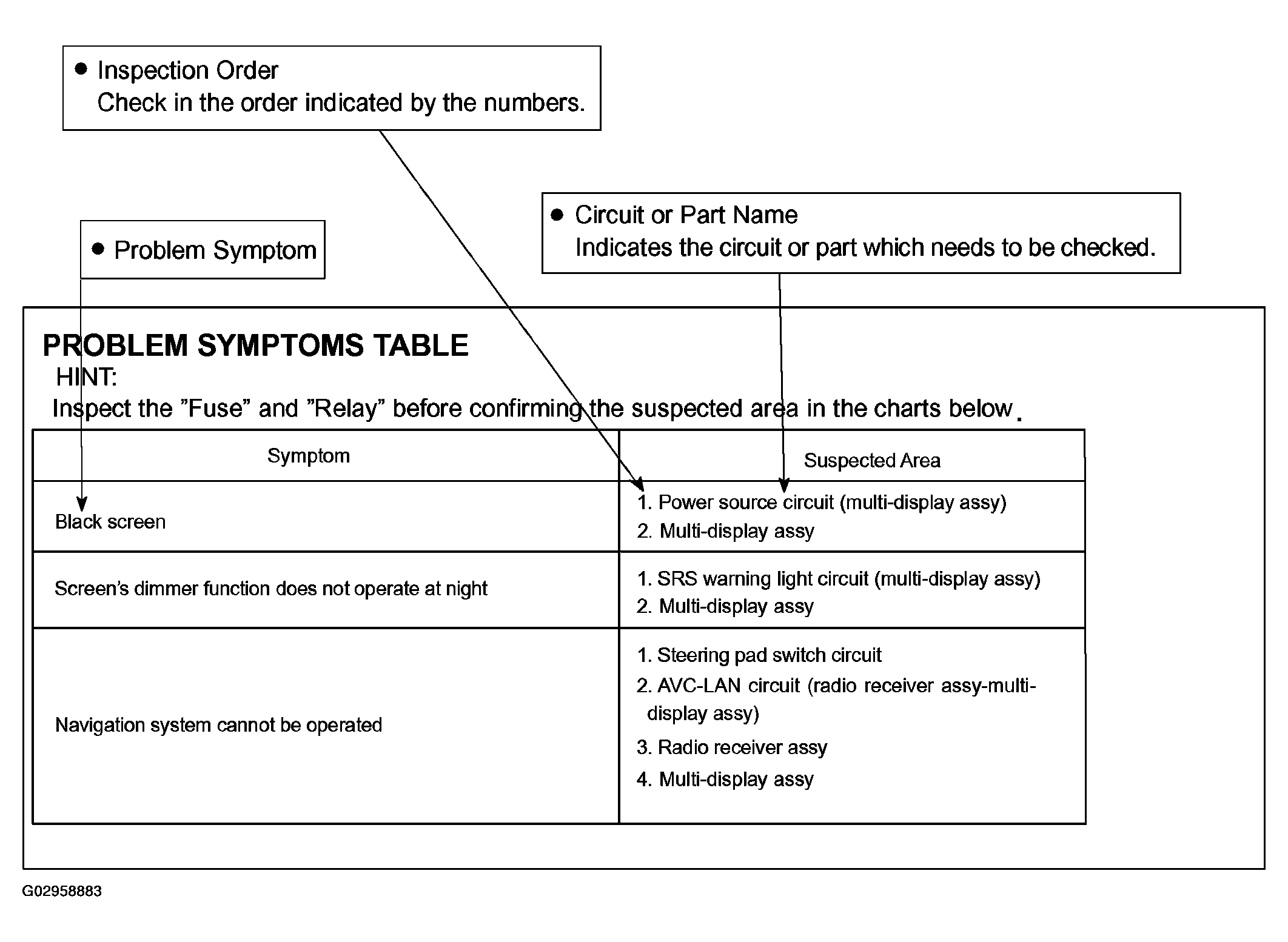 The suspected circuits or parts for each problem symptom are shown in Fig 1. Use this table to troubleshoot when, during a DTC check, a "Normal" code is displayed but the problem is still occurring. Numbers in the table show the inspection order in which the circuits or parts should be checked.