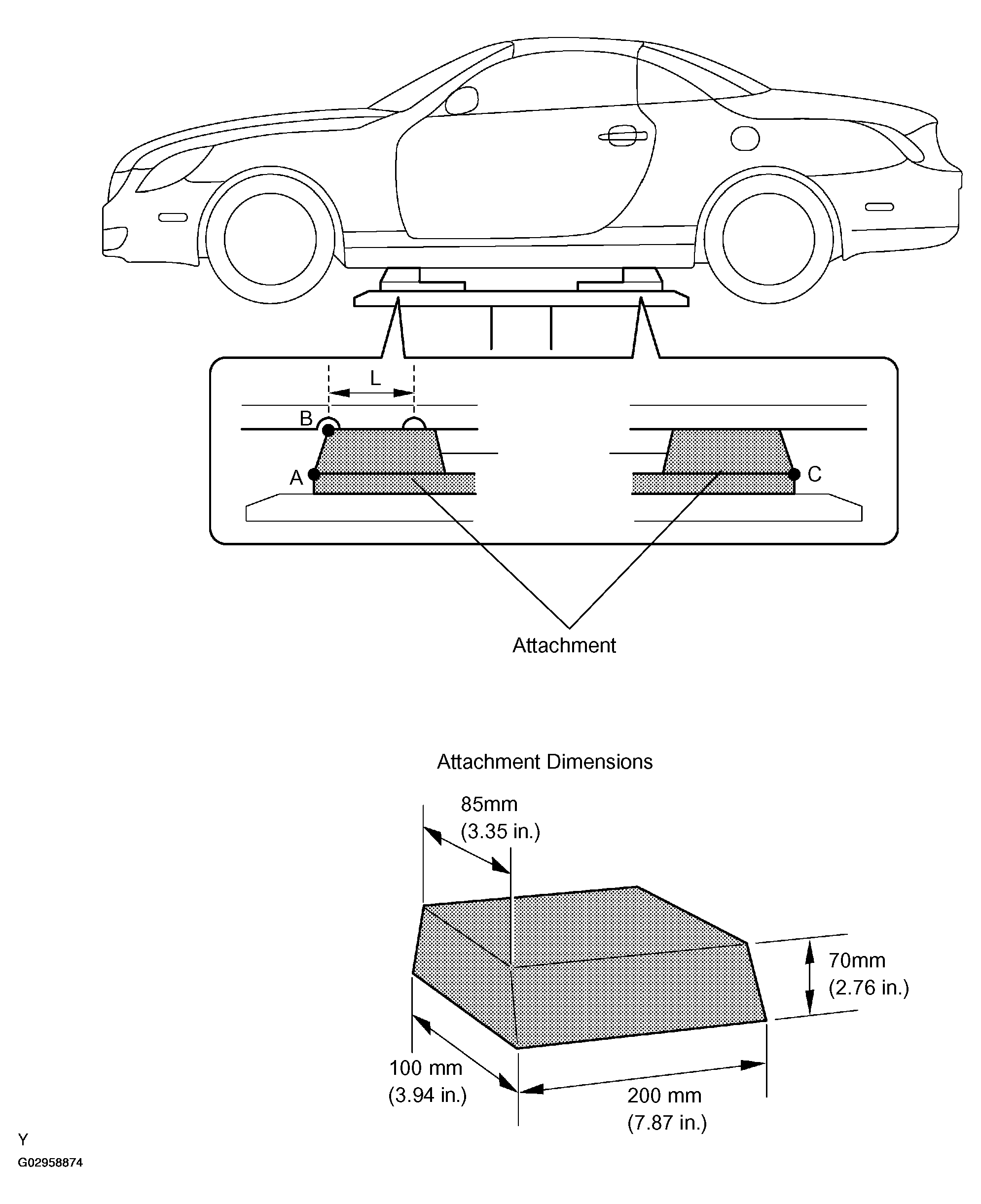 Right and left set position Place the vehicle over the center of the lift. Front and rear set position Place the attachments at the ends of the rubber plate surface, under the vehicle lift pad (A and C in Fig 3). Raise the plate slightly and reposition the vehicle so that top of the attachment (B in Fig 3) is aligned with the front side notch in the vehicle rocker flange. - Use the lift to lift the vehicle up off the ground, and stand at a safe distance and shake the vehicle to check its stability.