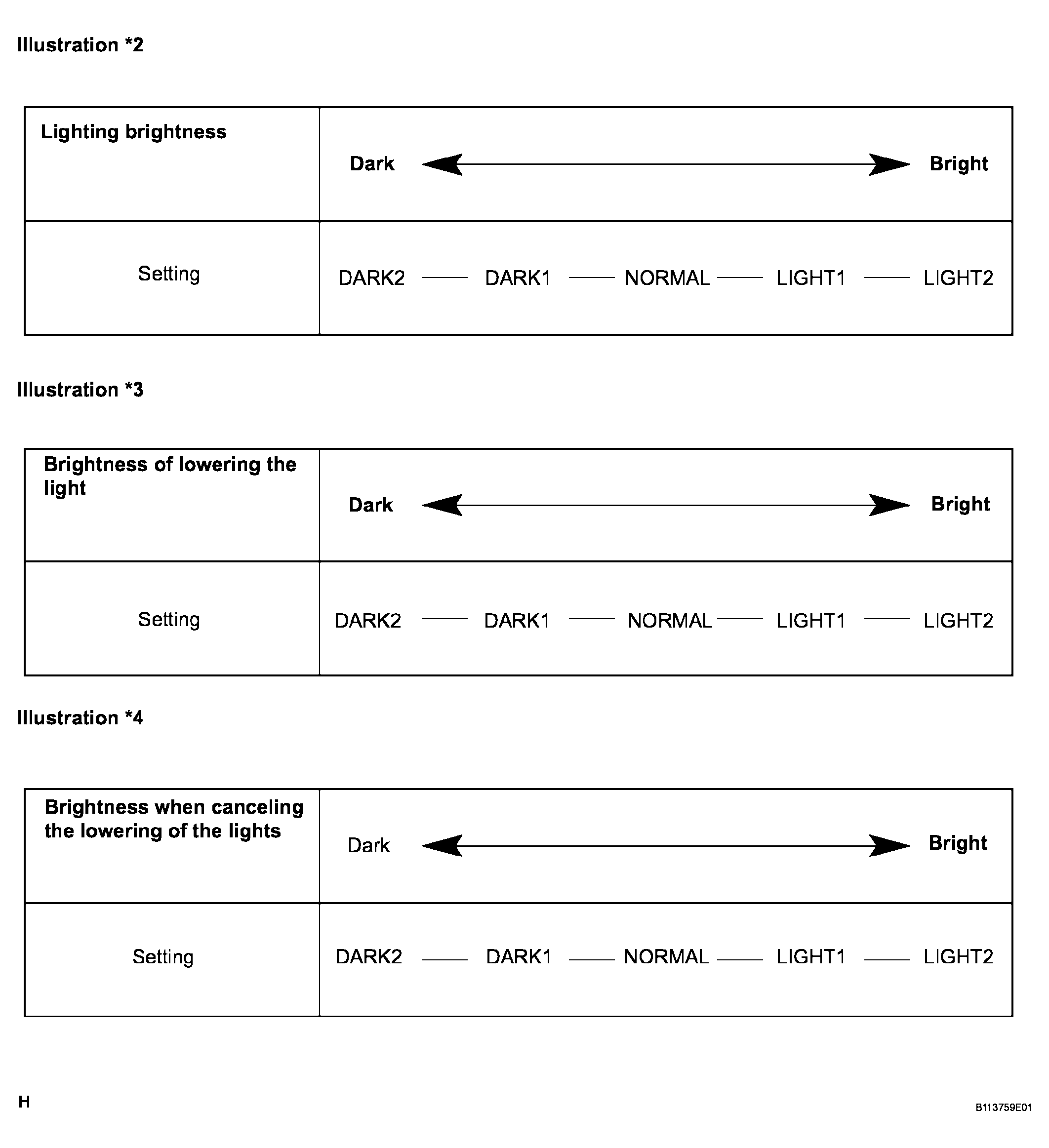 DISP EX OFF SEN (Display Extinction Release Luminous Intensity) NORMAL To change the brightness of canceling the lowering the lights such as the indicator light of the combination meter, A/C indicator light, clock. Refer to *4 illustration in Fig 1. DARK2 / DARK1 / NORMAL / LIGHT1 / LIGHT2
