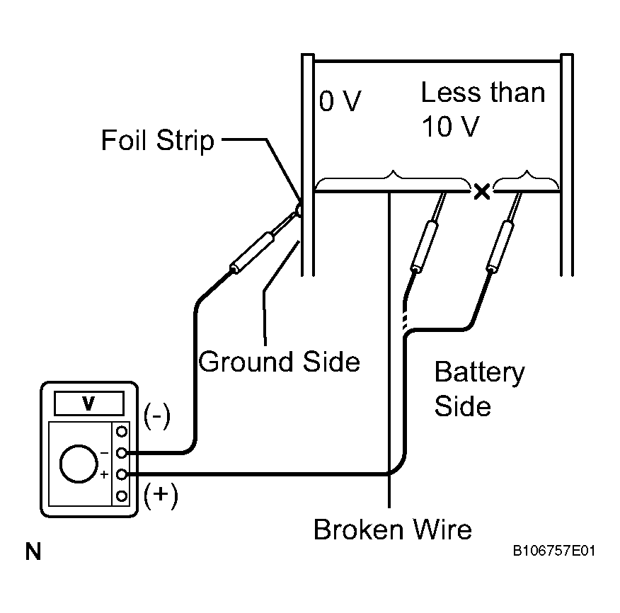 - Place the voltmeter's positive (+) lead against the defogger wire on the battery side.