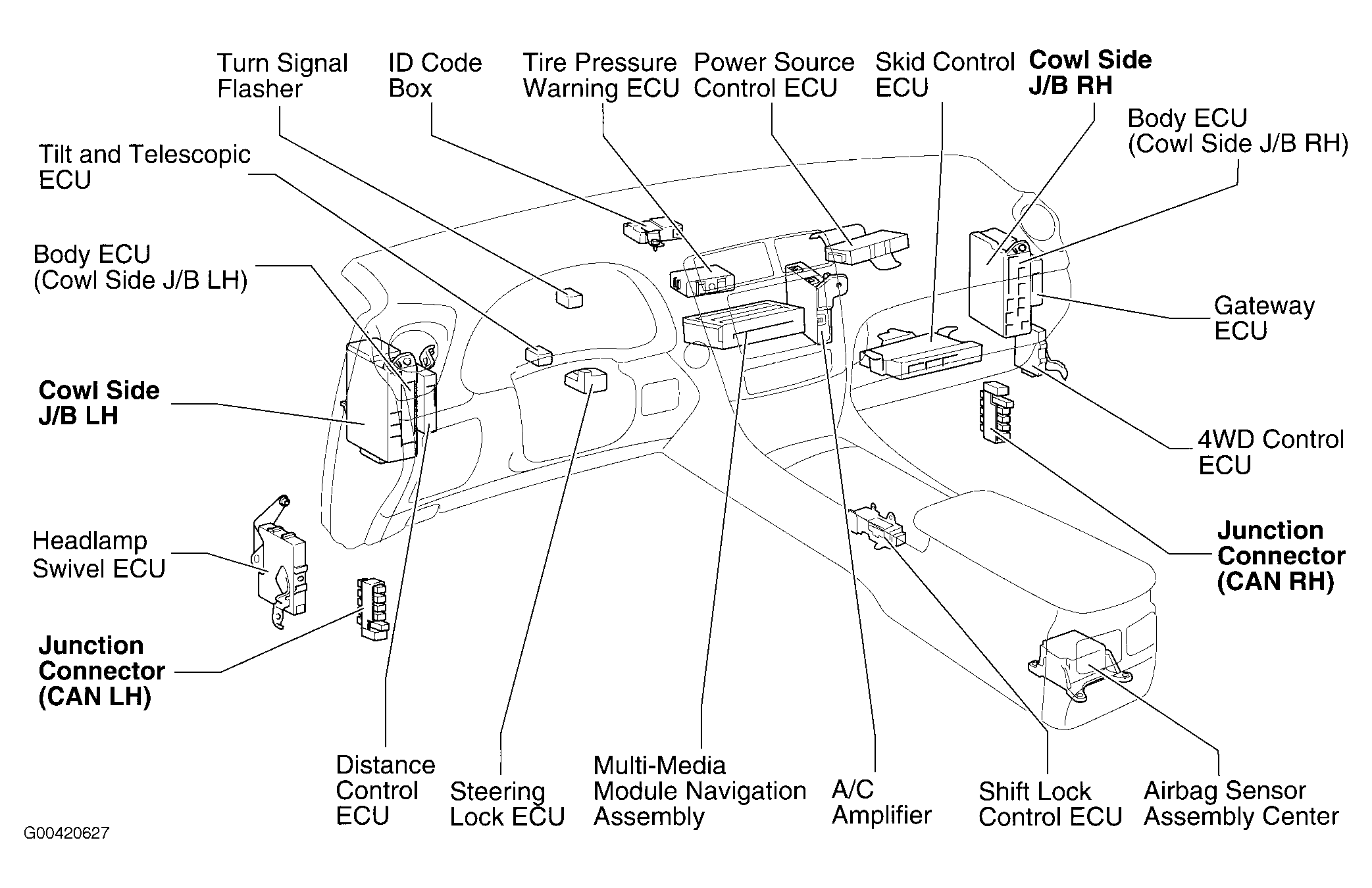 | Cowl Side J/B (LH) | At left end of dash. See Figure. |