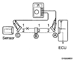 If the results match the examples above, an open circuit exists between terminal 1 of connector A and terminal 1 of connector C.
