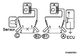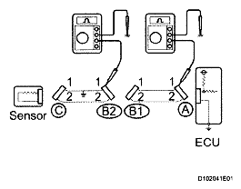 RESISTANCE SPECIFIED CONDITIONSTester Connection Specified Condition Connector A terminal 1 - Connector B1 terminal 1 Below 1 Ω Connector B2 terminal 1 - Connector C terminal 1 10 kΩ or higher If the results match the examples above, an open circuit exists between terminal 1 of connector B2 and terminal 1 of connector C.