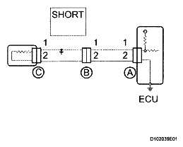 RESISTANCE SPECIFIED CONDITIONSTester Connection Specified Condition Connector A terminal 1 - Body ground 10 kΩ or higher Connector B2 terminal 1 - Body ground Below 1 Ω If the results match the examples above, a short circuit exists between terminal 1 of connector B2 and terminal 1 of connector C.