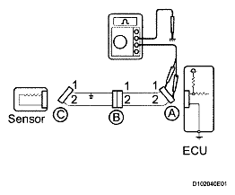 RESISTANCE SPECIFIED CONDITIONSTester Connection Specified Condition Connector A terminal 1 - Connector C terminal 1 10 kΩ or higher Connector A terminal 2 - Connector C terminal 2 Below 1 Ω Courtesy of © TOYOTA, LICENSE AGREEMENT TMS1002