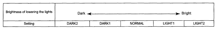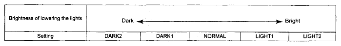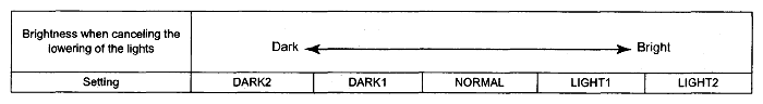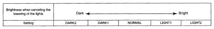 DISP EX ON SEN NORMAL Changes brightness when lowering lights such as combination meter indicator light, A/C indicator light, and clock light. Refer to the Fig 2. LIGHT2 / LIGHT1 / NORMAL / DARK1/DARK2