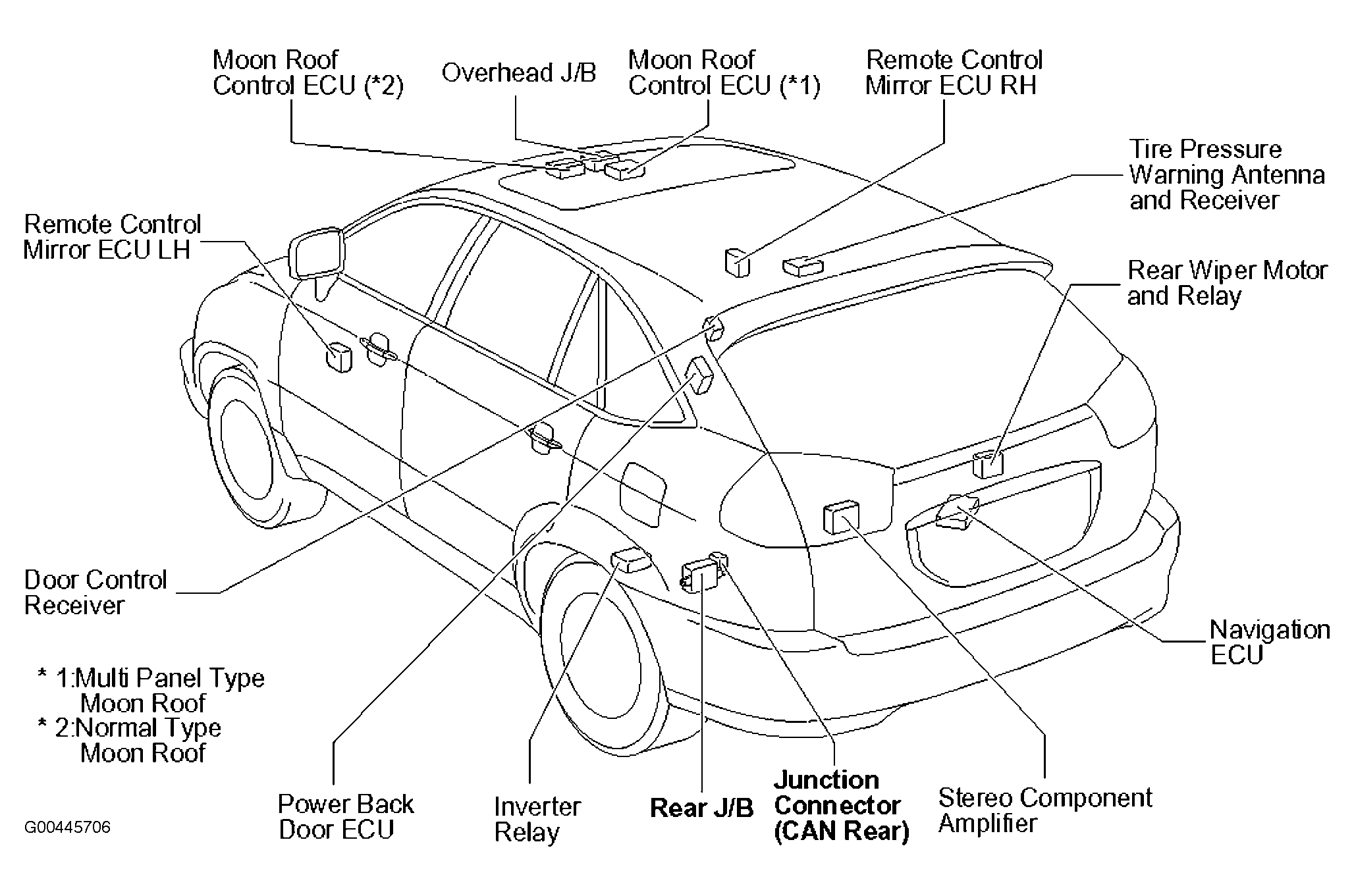 Moon Roof Control ECU (Multi Panel Type Moon Roof) Center front of roof. See Figure.