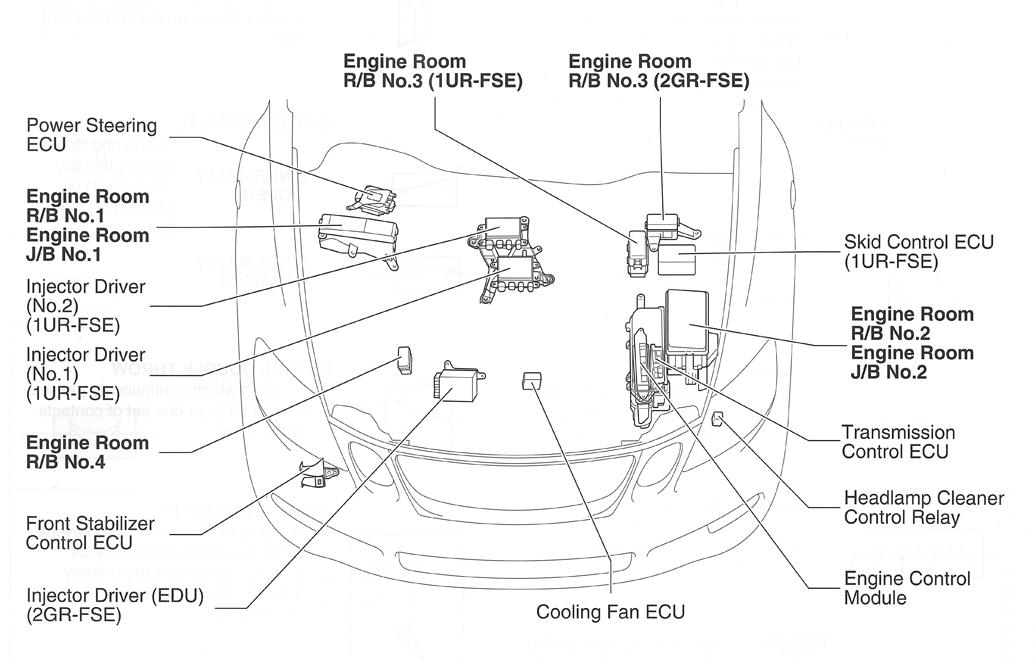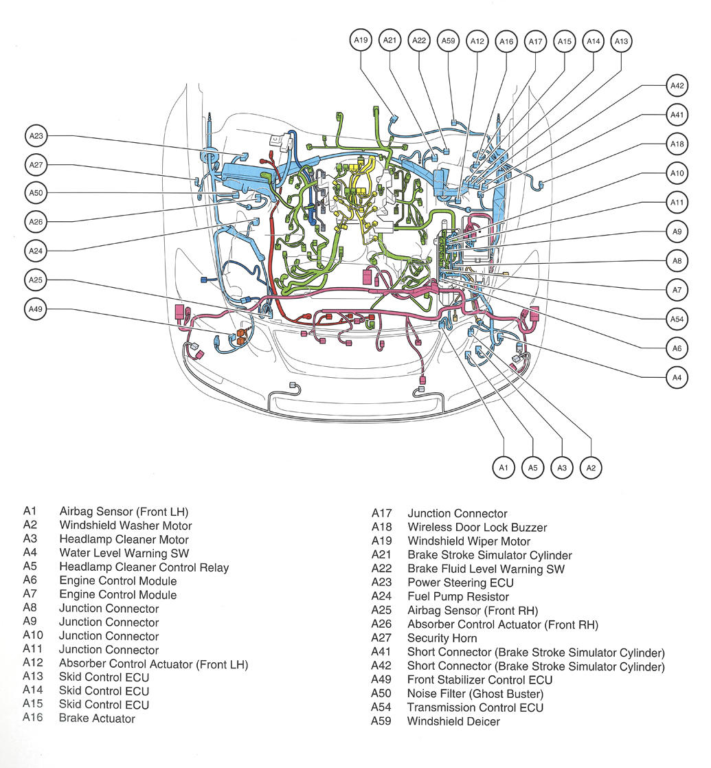 | Front Stabilizer Control ECU | Right front corner of engine compartment. See Figure. |