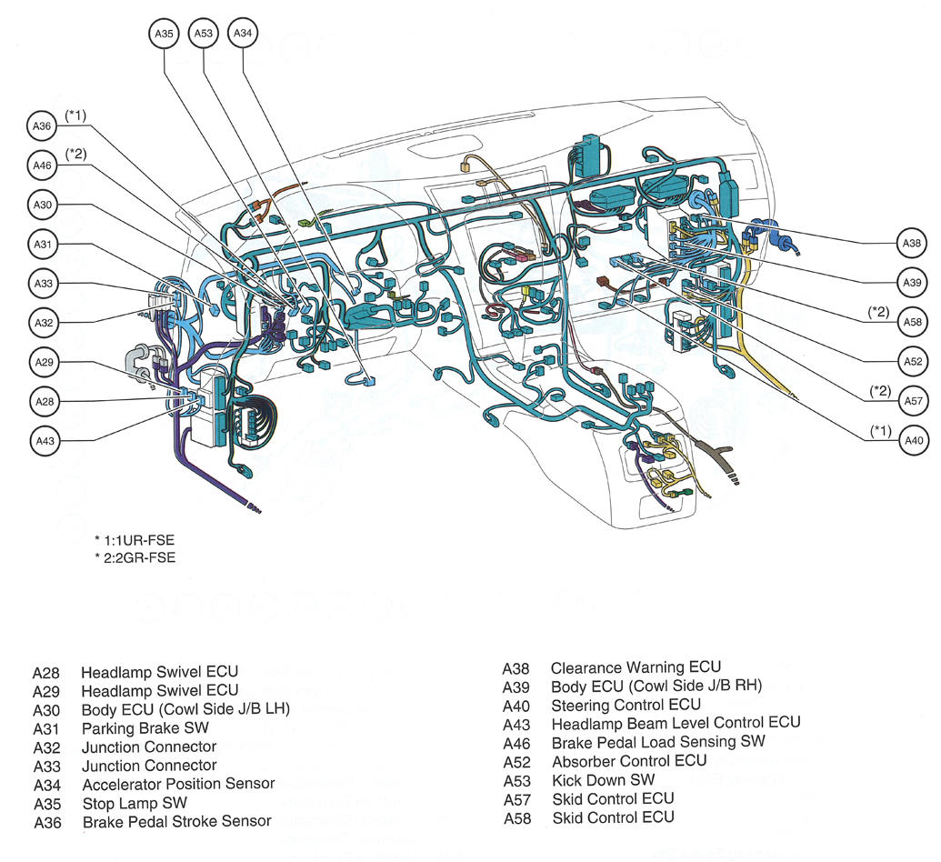 | Absorber Control ECU | Behind right end of dash. See Figure. |