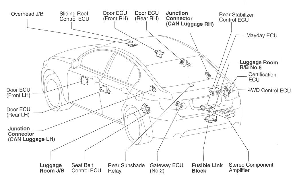 | Rear Stabilizer Control ECU | Right side of luggage compartment. See Figure. |