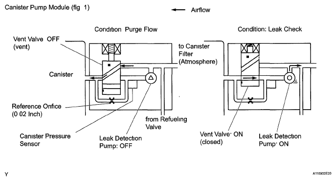 The leak detection pump creates negative pressure (vacuum) in the EVAP system and the pressure is measured Finally, the ECM monitors for leaks from the EVAP system, and malfunctions in both the canister pump module and purge VSV, based on the EVAP pressure