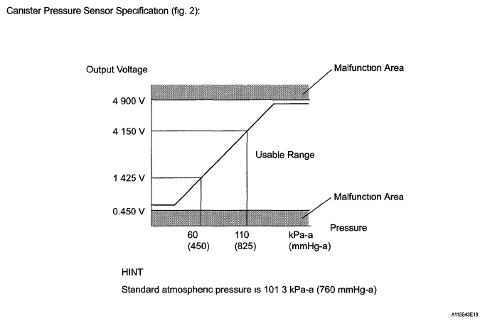 | Fuel tank pressure sensor | Converts fuel tank pressure into voltage and outputs that voltage ECM supplies a constant voltage of 5 V to pressure sensor and uses feedback from sensor to monitor fuel tank pressure (Fig 5) |