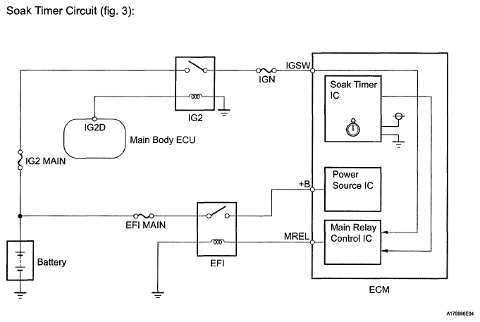 COMPONENTS OPERATION CHARTComponent Operation Canister Contains activated charcoal to absorb EVAP (Evaporative Emissions) generated in fuel tank. Cut-off valve Located in fuel tank. Valve floats and closes when fuel tank 100% full. Purge VSV (Vacuum Switching Valve) Opens or closes line between canister and intake manifold. ECM uses purge VSV to control EVAP purge flow. In order to discharge EVAP absorbed by canister to intake manifold, ECM opens purge VSV. EVAP discharge volume to intake manifold controlled by purge VSV duty cycle ratio (current-carrying time) (Open: ON; Closed: OFF). Refueling valve Controls EVAP pressure from fuel tank to canister. Valve consists of diaphragm, spring and restrictor (diameter: 0.08 inch). When fuel vapor and pressure inside fuel tank increase, valve opens. While EVAP purged, valve closes and restrictor prevents large amount of vacuum from affecting pressure in fuel tank. Valve opened while refueling. Roll-over valve Located in fuel tank. Valve closed by its own weight when vehicle overturns to prevent fuel from spilling out. Soak timer Built into ECM. To ensure accurate EVAP monitor, measures 5 hours (+/-15 min) after engine switch turned off. This allows fuel to cool down, stabilizing EVAP pressure. When approximately 5 hours elapsed, ECM activates (refer to Fig 6). Canister pump module Consists of (a) to (d) below. Canister pump module cannot be disassembled. (a) Vent valve Vents and closes EVAP system. When ECM turns valve on, EVAP system closed. When ECM turns valve off, EVAP system vented. Negative pressure (vacuum) created in EVAP system to check for EVAP leaks by closing purge VSV, turning on vent valve (closed) and operating leak detection pump (refer to Fig 4). (b) Canister pressure sensor Indicates pressure as voltages. ECM supplies regulated 5 V to canister pressure sensor, and uses feedback from sensor to monitor EVAP system pressure (refer to Fig 5). (c) Leak detection pump Creates negative pressure (vacuum) in EVAP system for leak check. (d) Reference orifice Has opening with 0.02 inch diameter. Vacuum produced through orifice by closing purge VSV, turning off vent valve and operating leak detection pump, to monitor reference pressure. Reference pressure indicates small leak of EVAP.