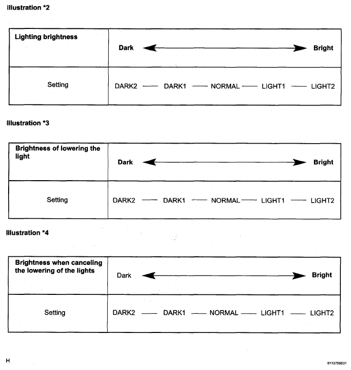 LIGHT CONTROL REFERENCE TABLEDISPLAY (ITEM) DEFAULT CONTENTS SETTING LIGHT OFF DELAY (Light Auto OFF Delay) 30 s Function to keep on lighting the headlight for a certain period of time after closing all the doors with the ignition switch turned OFF from ON under the condition that the light control switch is at HEAD or AUTO with the headlight ON. OFF / 30 s / 60 s / 90 s LIGHT CTRL TYPE (Control Type) CURRENT To change the control logic when the light control switch is AUTO position. Refer to ILLUSTRATION *1 REFERENCE TABLE . CURRENT / OLD SENSITIVITY (Turn ON luminous intensity) NORMAL To adjust the sensitivity of the lighting illumination. Refer to *2 illustration in Fig 1 . DARK2 / DARK1 / NORMAL / LIGHT1 / LIGHT2 DISP EX ON SEN (Display Extinction Luminous Intensity) NORMAL To change the brightness of lowering the lights such as the indicator light of the combination meter, A/C indicator light, clock. Refer to *3 illustration in Fig 1 . DARK2 / DARK1 / NORMAL / LIGHT1 / LIGHT2 DISP EX OFF SEN (Display Extinction Release Luminous Intensity) NORMAL To change the brightness of canceling the lowering the lights such as the indicator light of the combination meter, A/C indicator light, clock. Refer to *4 illustration in Fig 1 . DARK2 / DARK1 / NORMAL / LIGHT1 / LIGHT2 HINT: