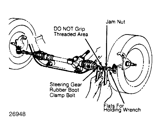When tie rod jam nuts are loosened for adjustment, threads must be cleaned, lubed and tightened. DO NOT grip threads while loosening jam nut or tear rubber boot on tie rod during adjustment.