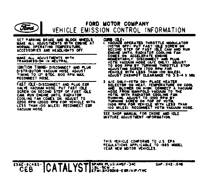 To identify engine calibration number, locate engine code label at front of engine. There are several label styles; engine calibration number is shown on each. See Fig 1. Calibration codes usually begin with a number indicating current model year. For example, calibrations for 1987 usually begin with "7". Each vehicle is also equipped with an emission control data decal which applies to that vehicle and engine. See Fig 2. These decals are usually located on underside of hood or other visible engine compartment location.