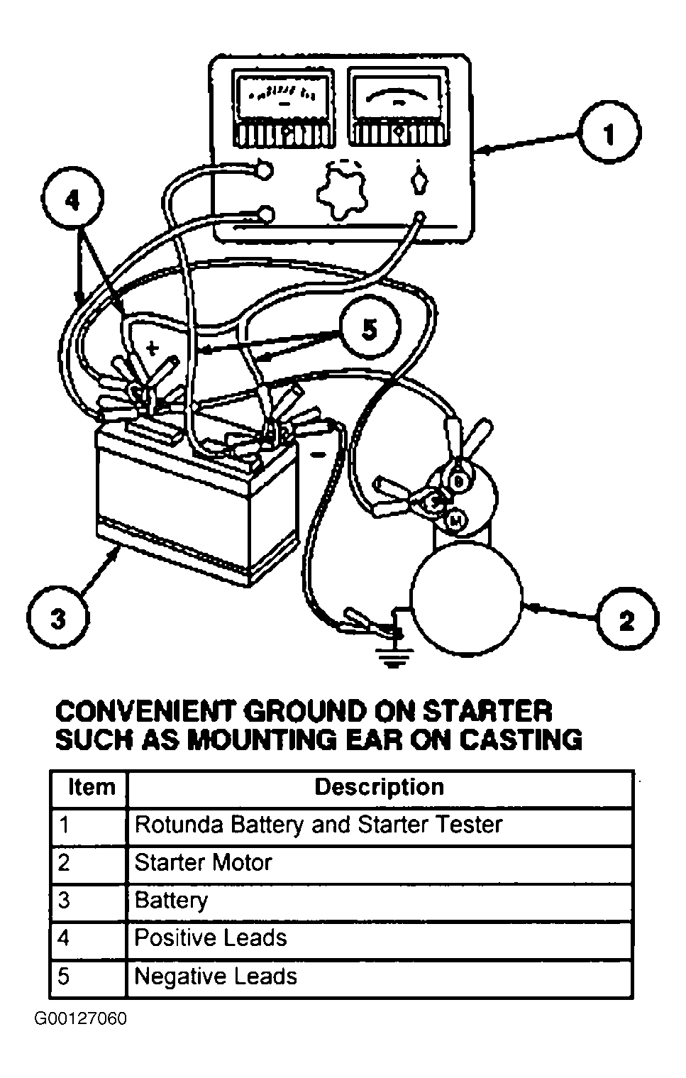 - Make test connections with Rotunda Battery and Starter Tester (010-00725), or equivalent cables connected to starter motor, large enough to carry high current (the same as in the vehicle). See Fig 1 . The starter motor will run at no-load. Be sure that no current is flowing through ammeter (rheostat at maximum counterclockwise position). Determine exact reading on voltmeter.