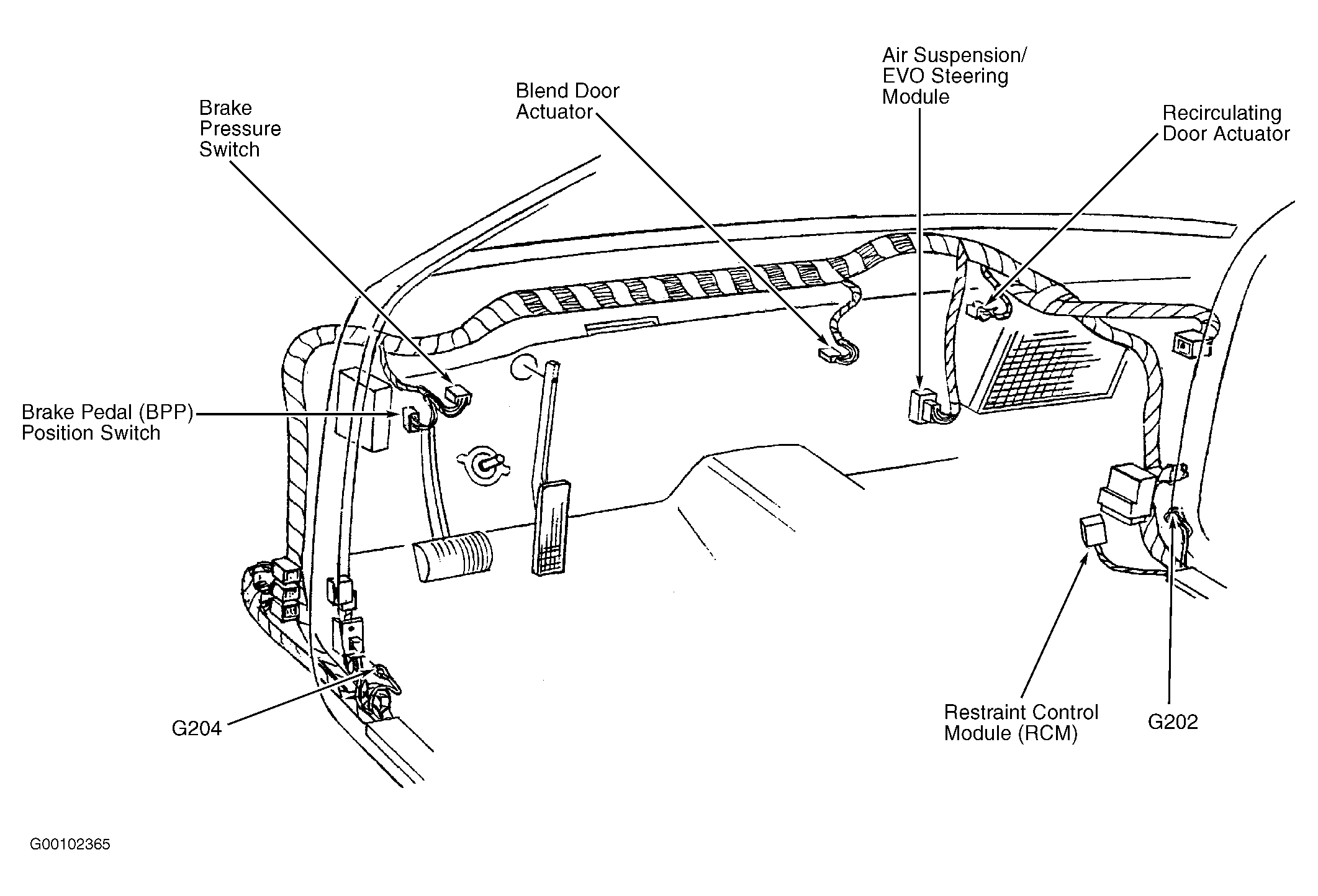 | Restraint Control Module (RCM) | Behind right side of dash, in front of air recirculation duct. See Figure. |