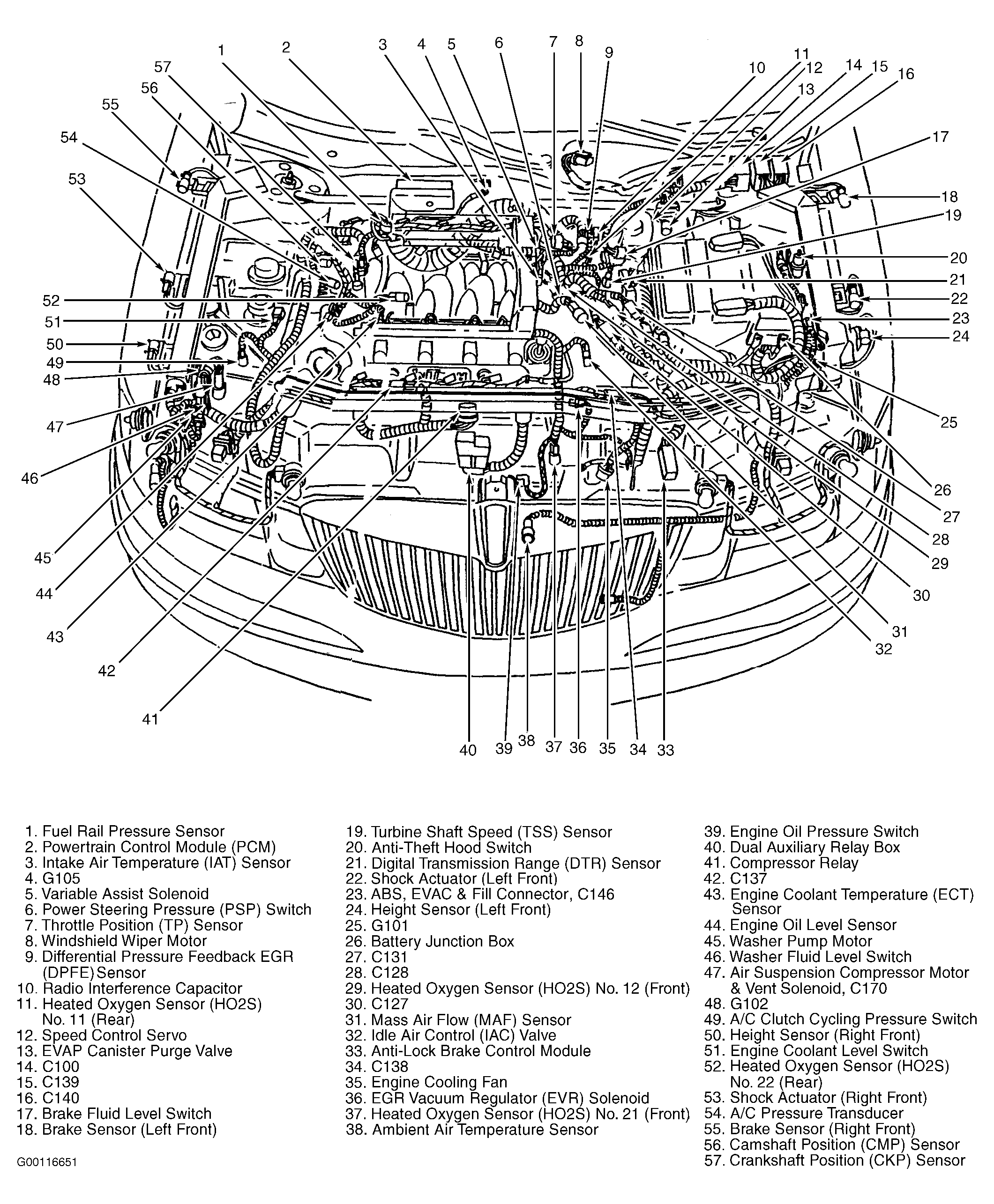 | Powertrain Control Module (PCM) | On top right side of firewall, under splash shield. See Figure. |