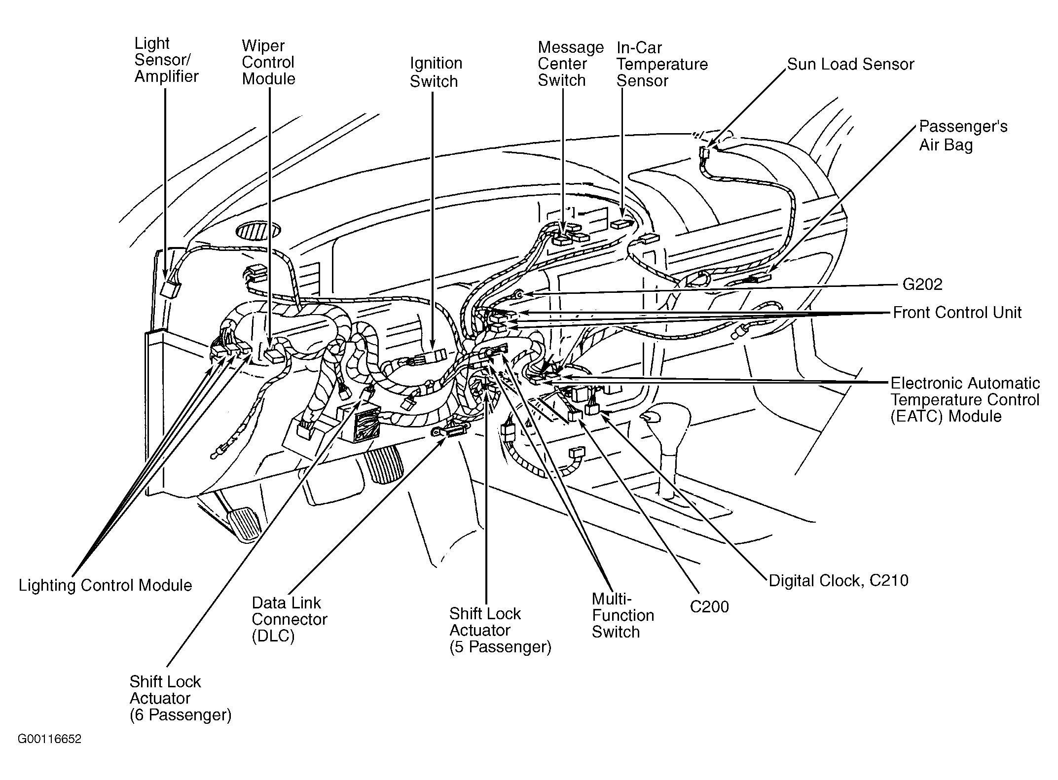 | Front Control Unit | At center of dash. See Figure. |