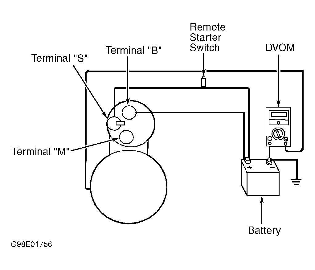 1. Disconnect inertia fuel shutoff switch to prevent vehicle from starting. Connect remote starter switch between starter solenoid terminal "S" and positive battery post. See Fig 1 . Connect positive DVOM lead to starter housing, and negative lead to negative battery post.