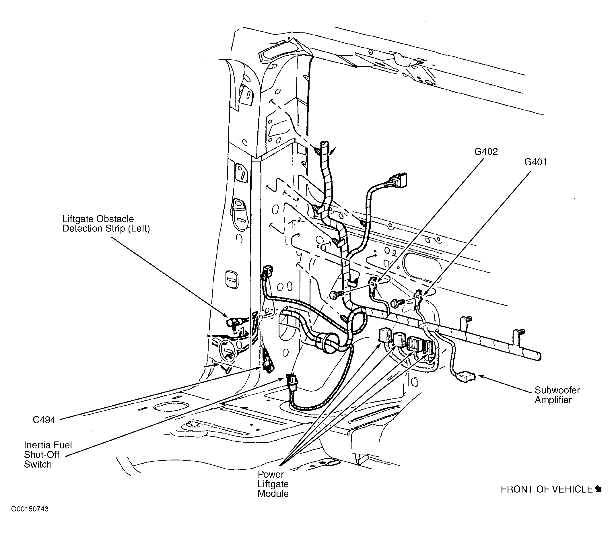 Power Liftgate Module At left side of cargo area, behind trim. See Figure.