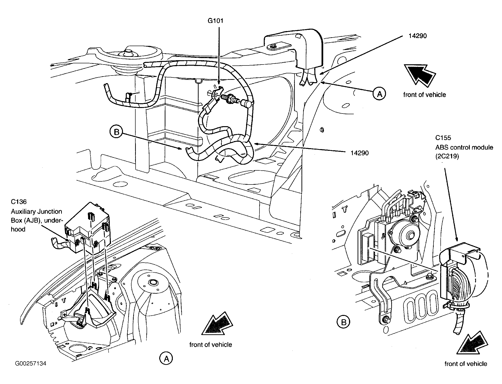 | ABS Control Module | Right front side of engine compartment. See Figure. |