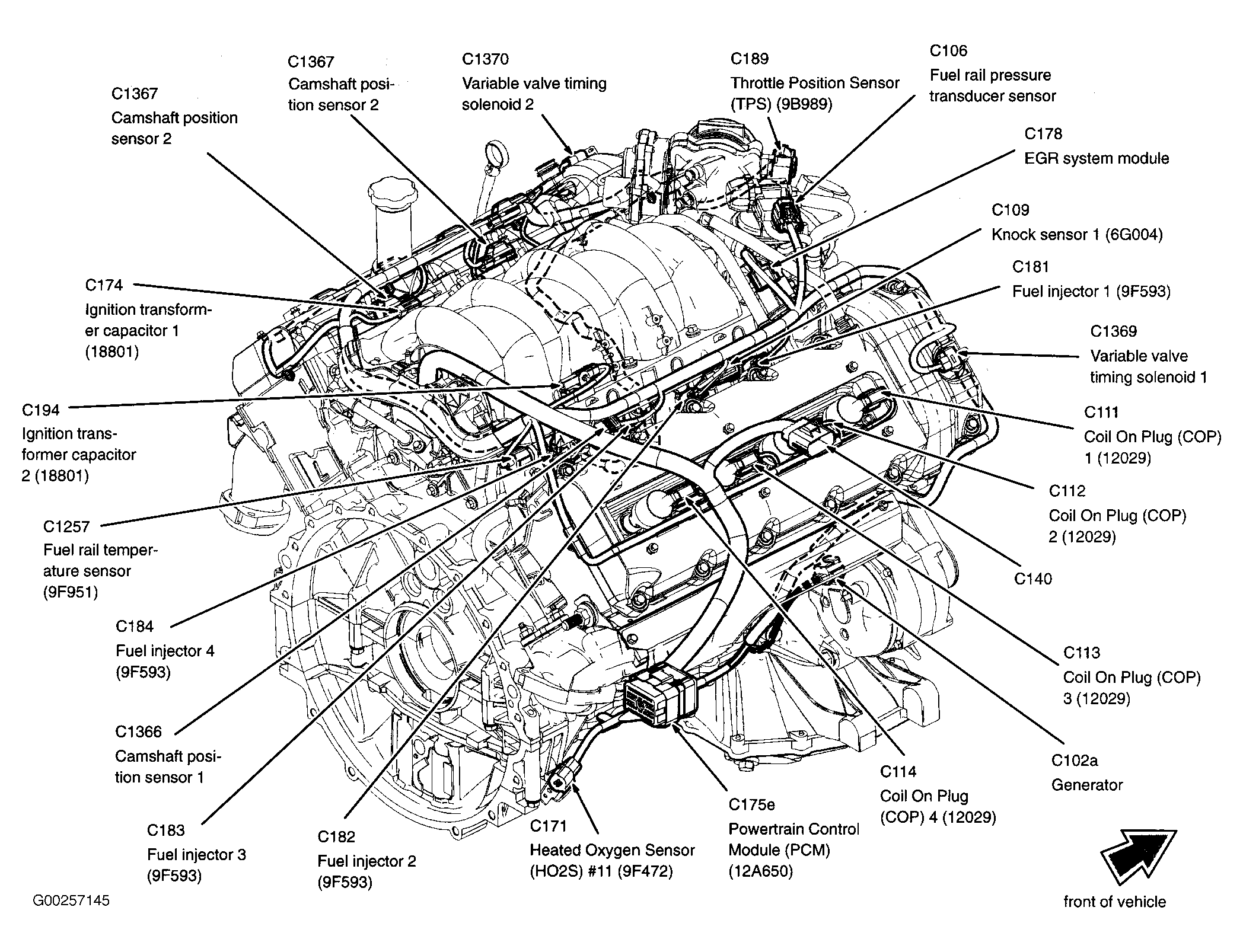 | Powertrain Control Module (PCM) | Right rear of engine compartment. See Figure. |