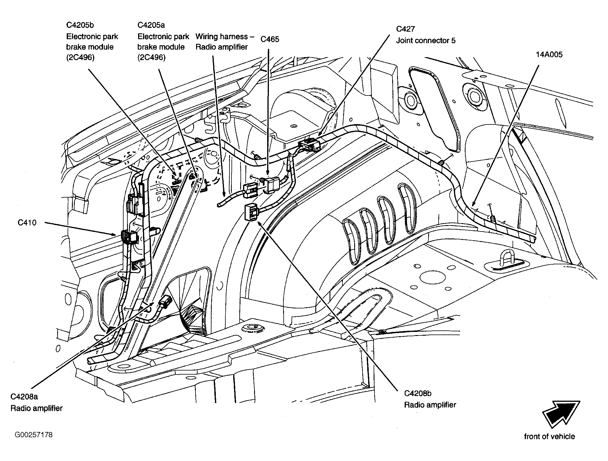 | Electronic Park Brake Module | At left side of luggage compartment. See Figure. |