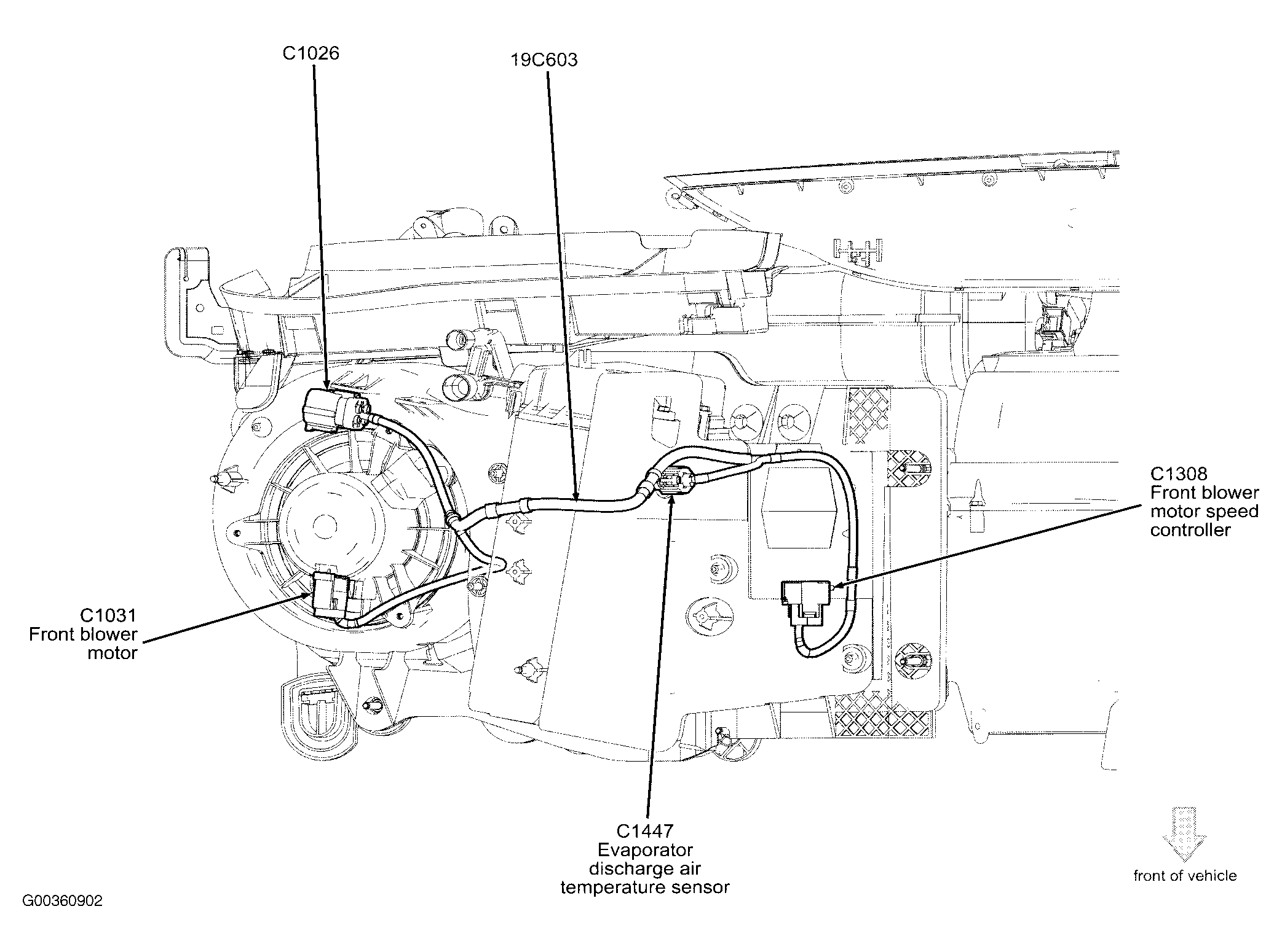| Front Blower Motor Speed Controller | In right rear of engine compartment, on evaporator housing. See Figure . |